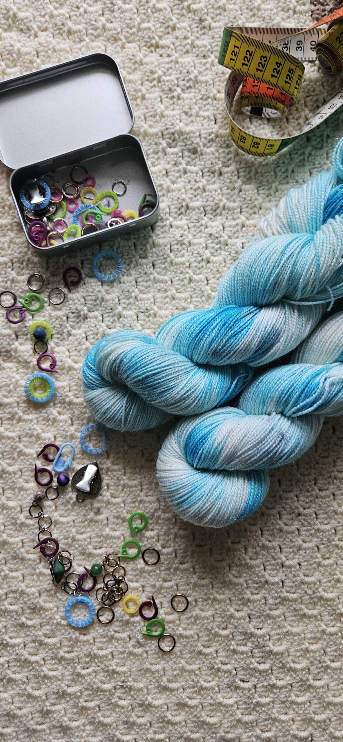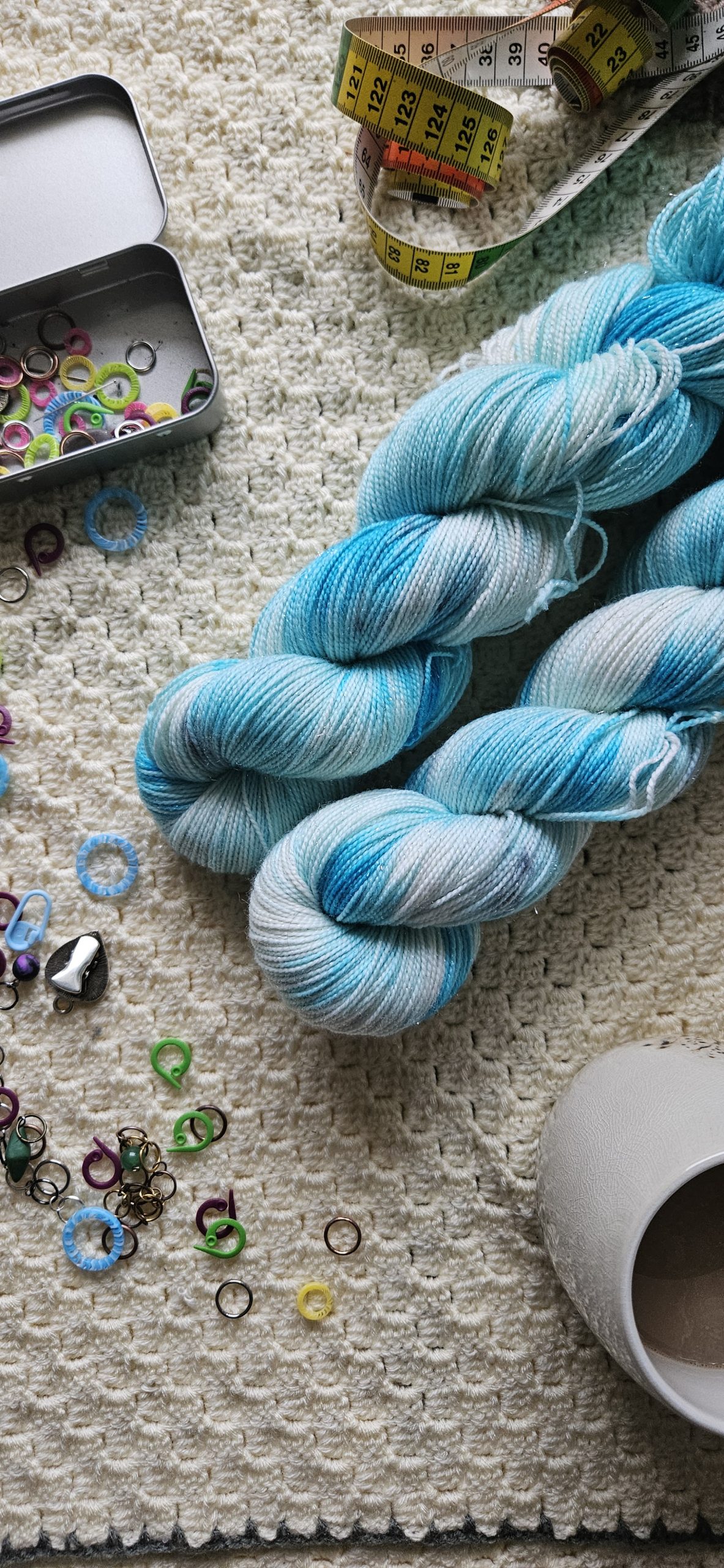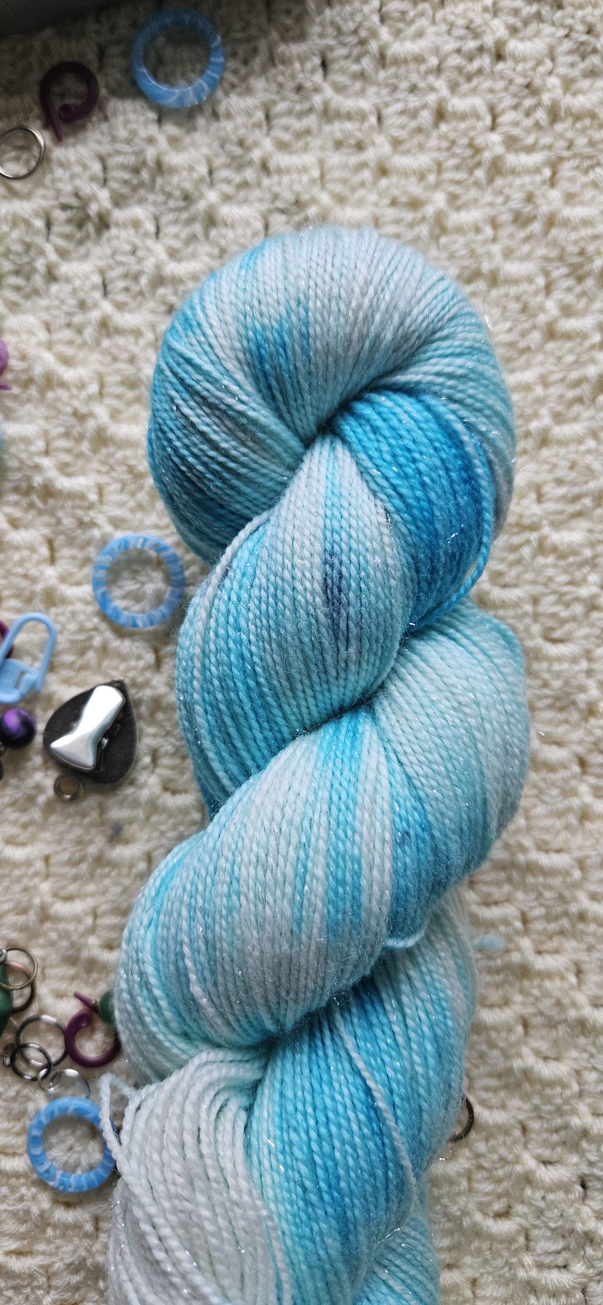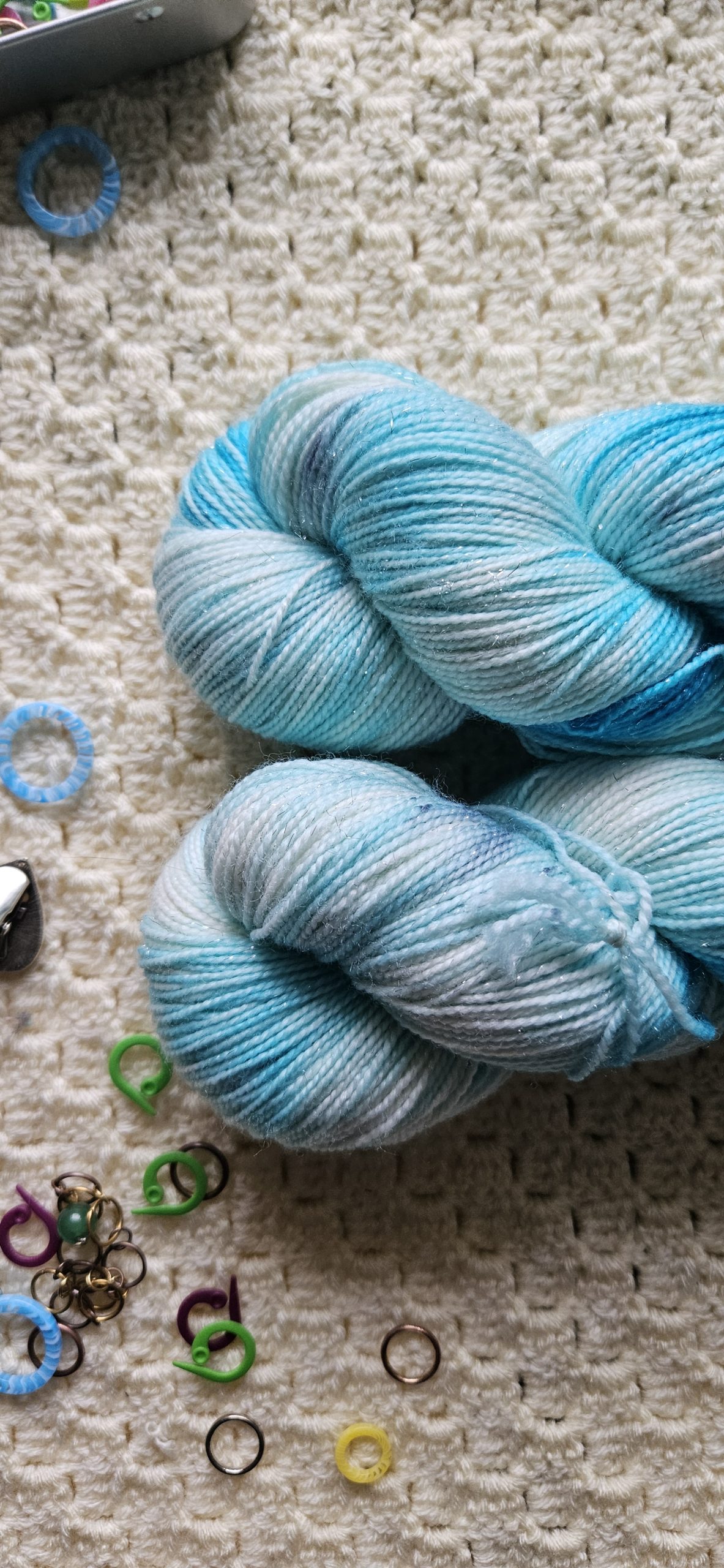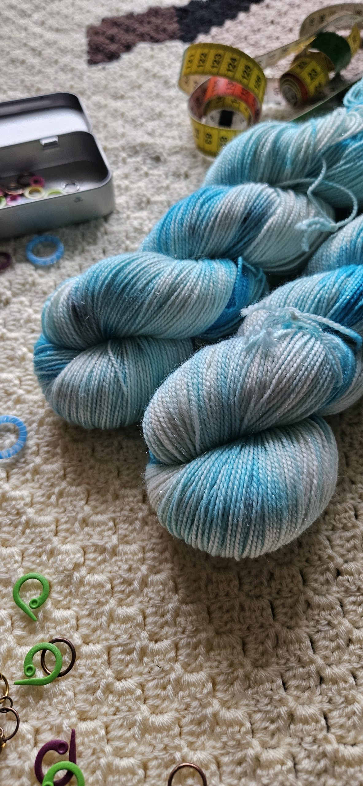 Mød Skyblue Budgie, et garn der stråler af lethed og luftige drømme. Med sin base af 75% superwash-merinould og 20% nylon er det både blødt og slidstærkt, mens de 5% sølv stellina tilføjer et magisk glimmer, der glitrer som lyset i en fugls vinger under en skyfri himmel.